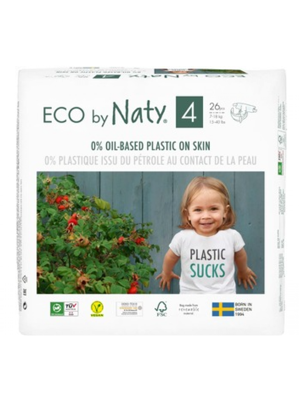 Наши подгузники содержат 0% жирного пластика для кожи вашего ребенка и 0% вредных химикатов. Вам не нужно излишне беспокоиться о опрелостях или ужасных кожных реакциях, так как на кожу вашего ребенка наносятся только растительные вещества. В основе подгузников лежит 100% сертифицированная FSC древесная масса, которая является органической и очень хорошо впитывает жидкость. Остальные слои изготовлены из натуральных биоразлагаемых материал