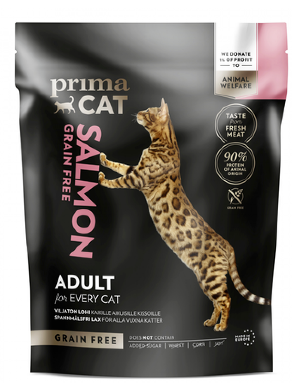 PrimaCat Grainless Salmon для всех взрослых кошек родился из желания финских владельцев кошек иметь на рынке мясной и беззерновой корм для кошек. Основными ингредиентами в нашем рецепте без зерна и кукурузы являются свежий вкусный лосось и прекрасно усвояемая курица. Кормить кошку - это умение, и мы хотим предложить самую лучшую помощь, поэтому в наших сухих кормах используется свежая, привлекательная для кошек рыба. Лосось также является отличным источником жирных кислот Омега, а его изначально более высокое содержание Омега-3 уравновешивает состав жирных кислот в пище. Наш корм без злаков со вкусом лосося подходит для всех активных домашних кошек. Злаки были заменены альтернативными источниками углеводов, которые часто также подходят для кошек с чувствительным желудком.