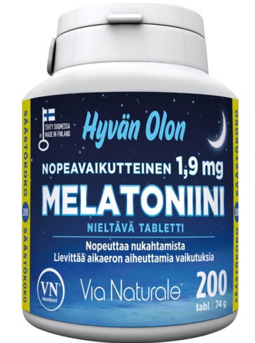 Мелатонин Орион Таблетки мелатонина с пролонгированным высвобождением 1,9 мг помогают сократить время засыпания и смягчить отдельные эффекты разницы во времени (джетлаг). Эффект достигается за счет уменьшения времени засыпания на 1 мг и влияния разницы во времени с дозой, по меньшей мере, 0,5 мг мелатонина перед сном. Без лактозы, без глютена, без дрожжей и сои. Не содержит желатин. Нет ингредиентов животного происхождения, веганский. Пищевая добавка.